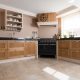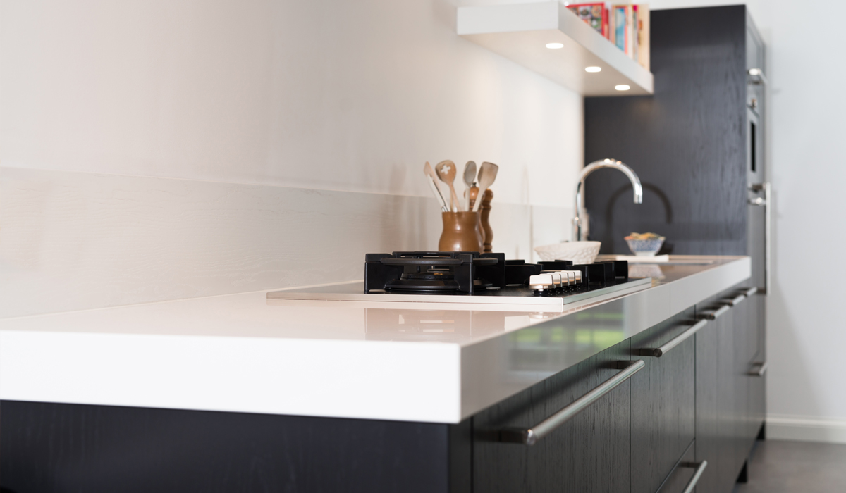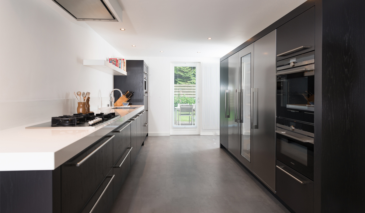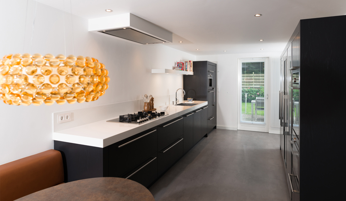Er is gekozen voor eikenfineer, donker spuitwerk en een licht werkblad. De afzuigkap is verwerkt in het plafond en de keuken heeft strakke lijnen. Dit alles geeft de keuken een luxe en moderne uitstraling.