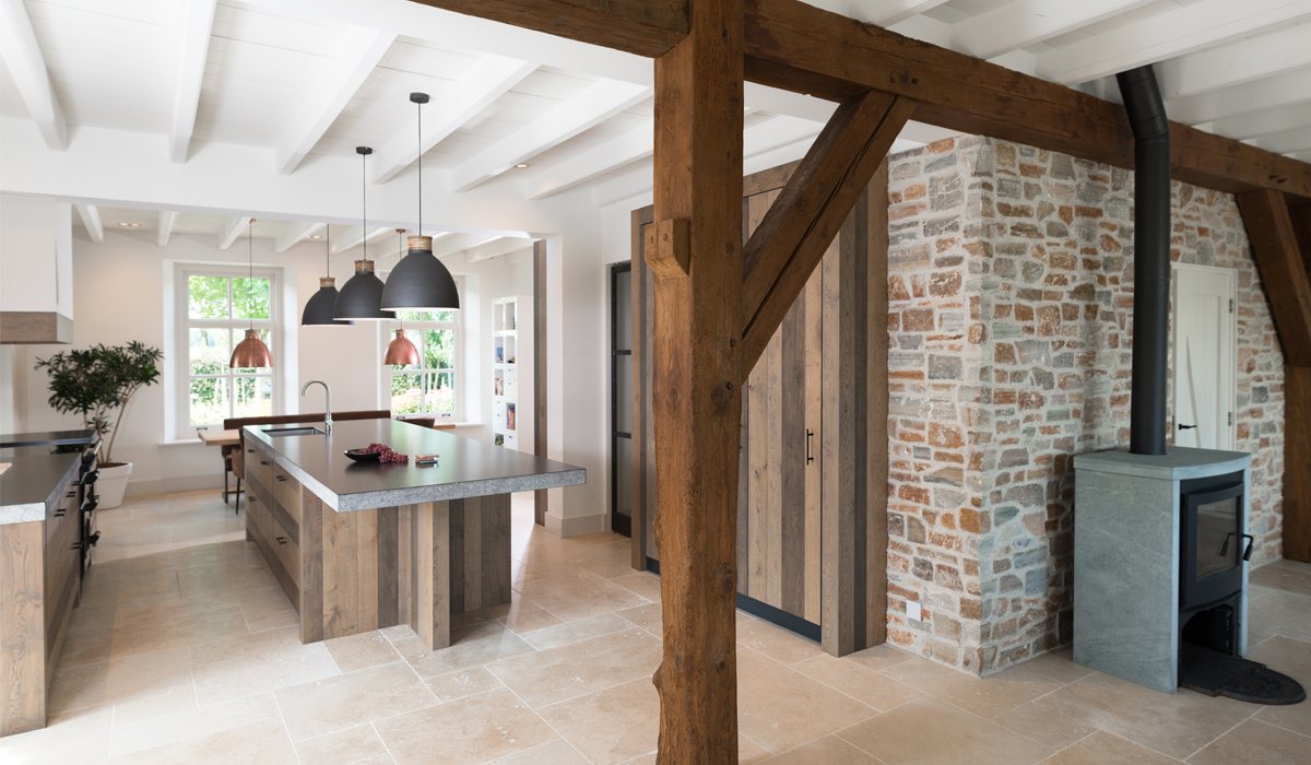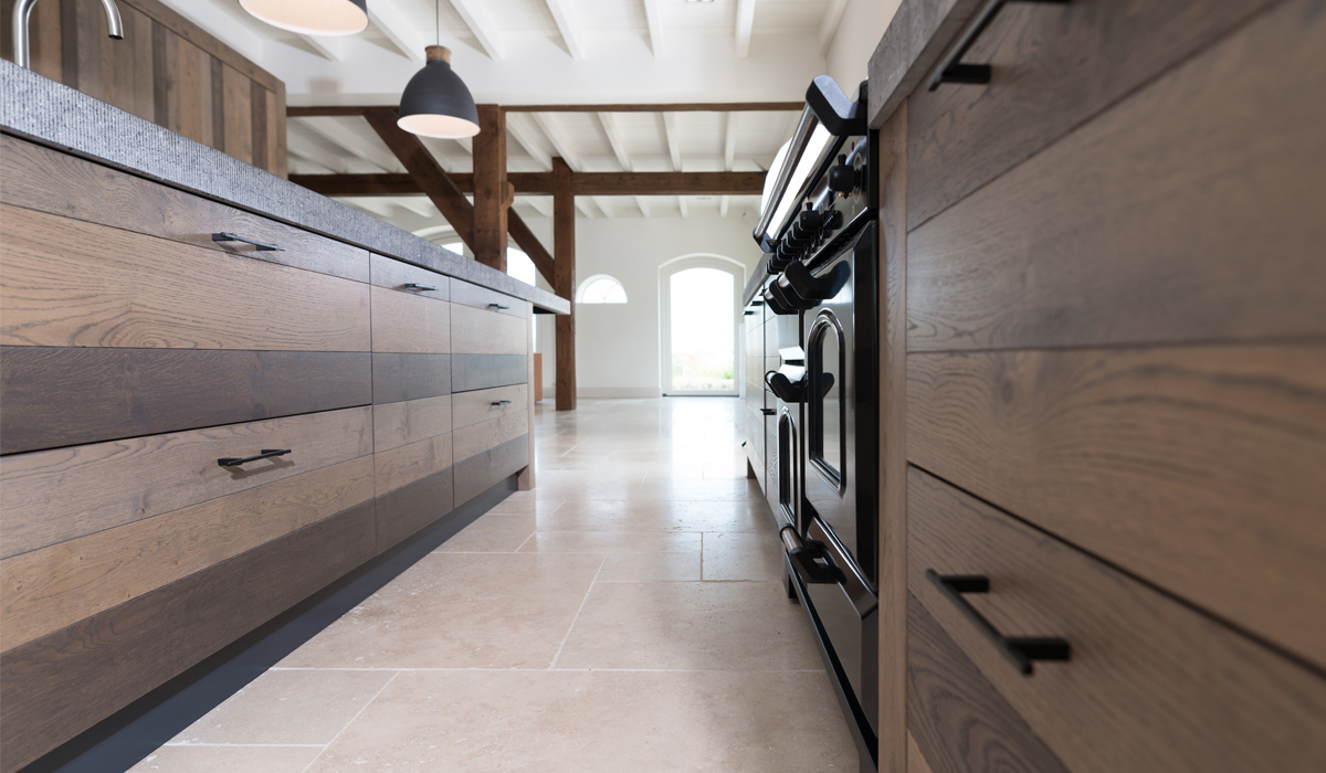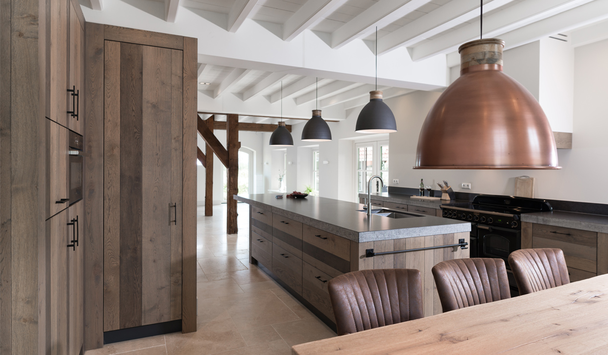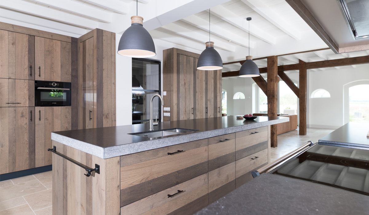 Deze zeer exclusieve keuken bevindt zich in een strak afgewerkte woonboerderij. De keuken is gemaakt van massief eiken planken, gebeitst in vier verschillende tinten. De binnenkasten zijn in een donkere kleur afgewerkt. Het werkblad is van composiet en heeft gefrijnde randen. De handgrepen op het fornuis zijn speciaal gemaakt, zodat het fornuis helemaal aansluit bij de stijl van deze keuken.