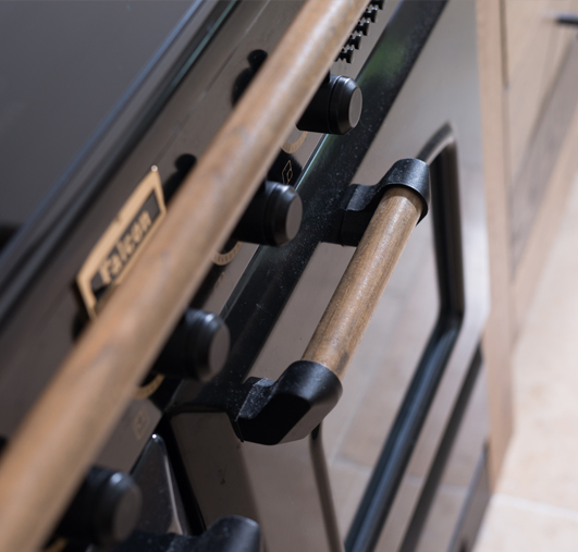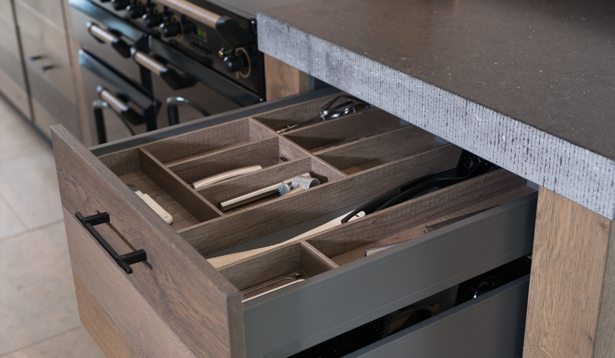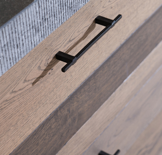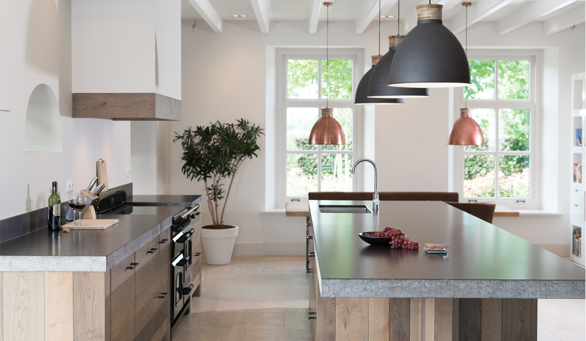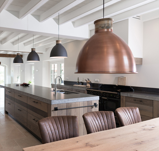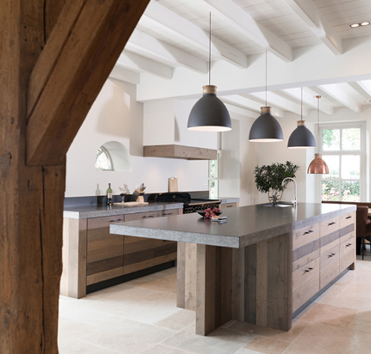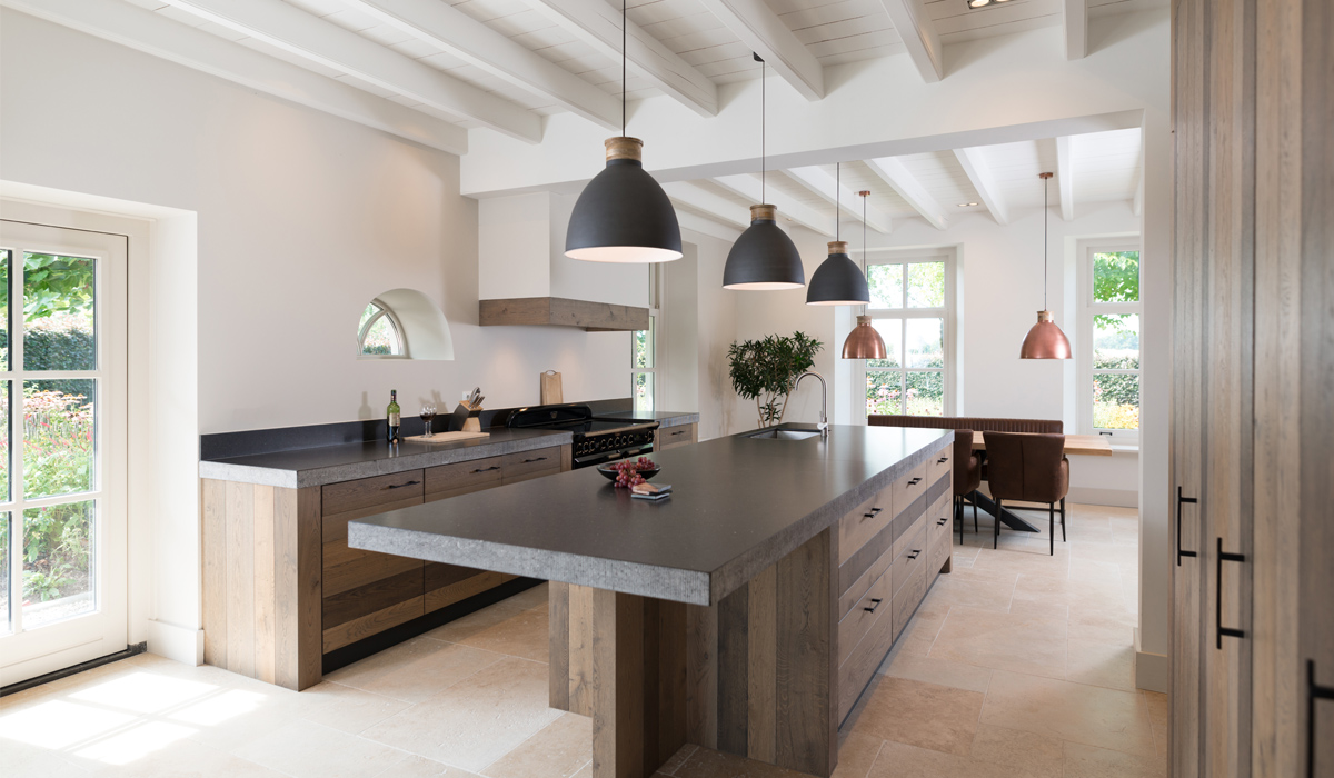 Deze zeer exclusieve keuken bevindt zich in een strak afgewerkte woonboerderij. De keuken is gemaakt van massief eiken planken, gebeitst in vier verschillende tinten. De binnenkasten zijn in een donkere kleur afgewerkt. Het werkblad is van composiet en heeft gefrijnde randen. De handgrepen op het fornuis zijn speciaal gemaakt, zodat het fornuis helemaal aansluit bij de stijl van deze keuken.