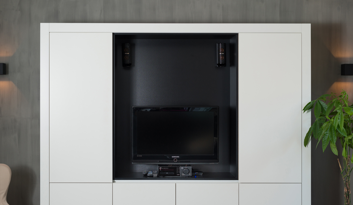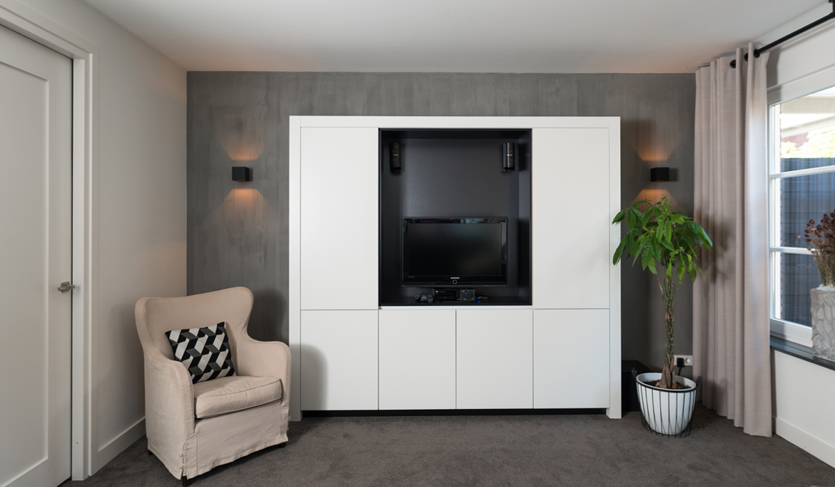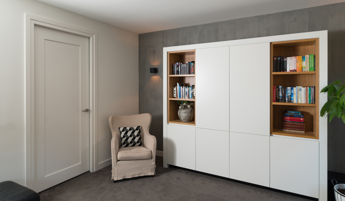Voor deze veelzijdige kast zijn verschillende materialen toegepast. Alles is voorkant gelijk gemaakt. De kastdeuren zijn greeploos te openen via tip on. In de kast zit een geavanceerd schuifdeur-systeem, zodat het systeem zo min mogelijk te zien is.